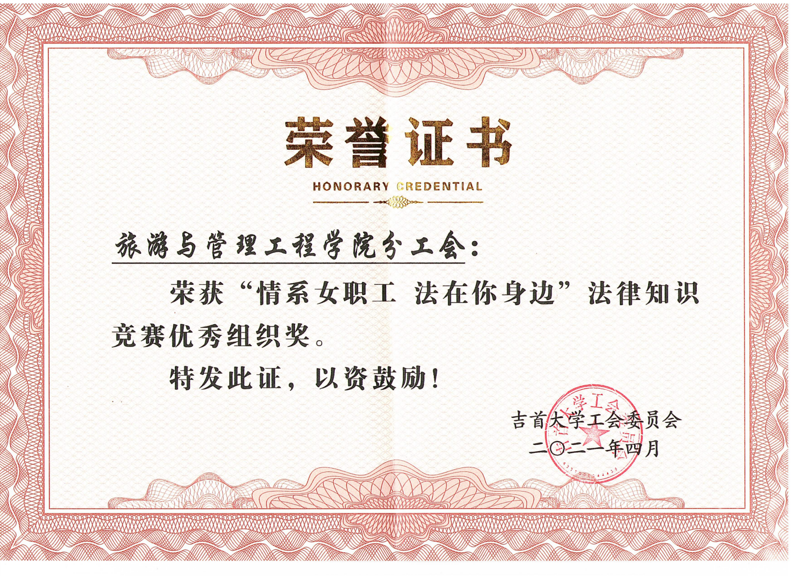 4月28日,在bv伟德国际1946庆祝“五一”国际劳动节工会工作表彰会上,旅游与管理工程公司分工会荣获“情系女职工 法在你身边”法律知识竞赛优秀组织奖。