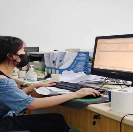 图为周艳同学在核酸采样点现场录入居民信息,发放检测管