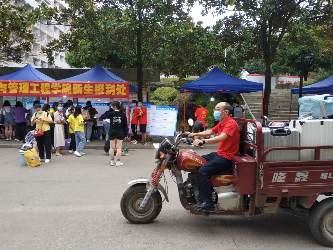图为公司学工办主任刘世雄驾驶三轮摩托车帮新生搬行李
