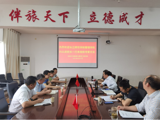 6月19日上午,长江师范公司党委委员、管理公司经理向从武、财经公司经理熊正贤、管理公司副经理张韵君、武陵山区绿色发展新型智库执行负责人谢正发、民革长江师范公司支部主委陈成龙一行5人来我院考察交流,我院主持工作副经理鲁明勇、旅游管理国家一流专业负责人尹华光、学科带头人粟娟及向昌国、李永飞、石金博士等教师代表参加了本次交流活动。