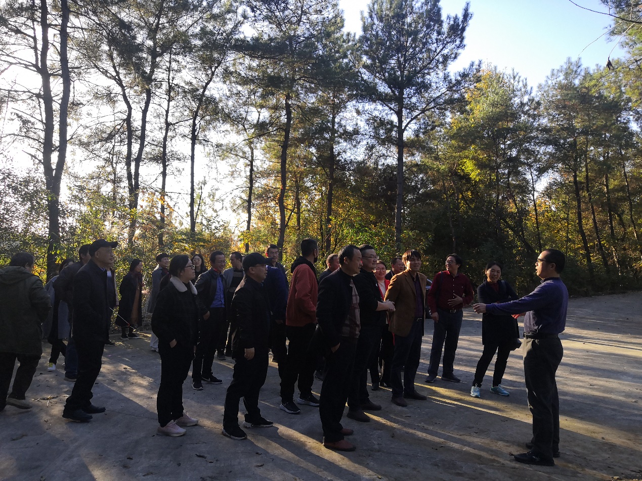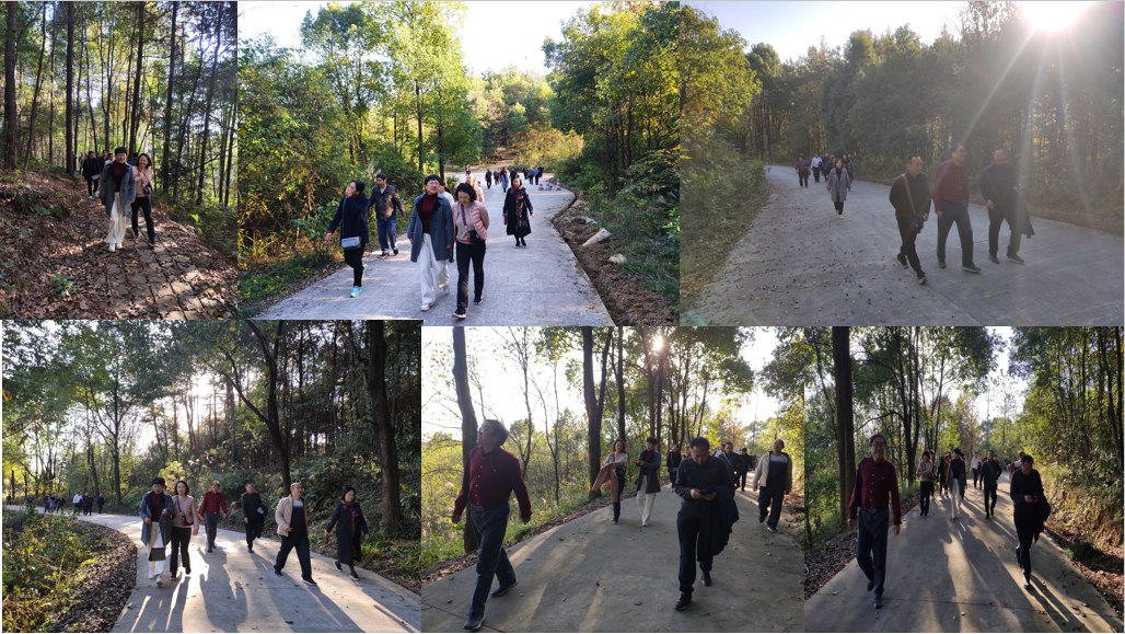 图为冬日暖阳下漫步山林的教职工们