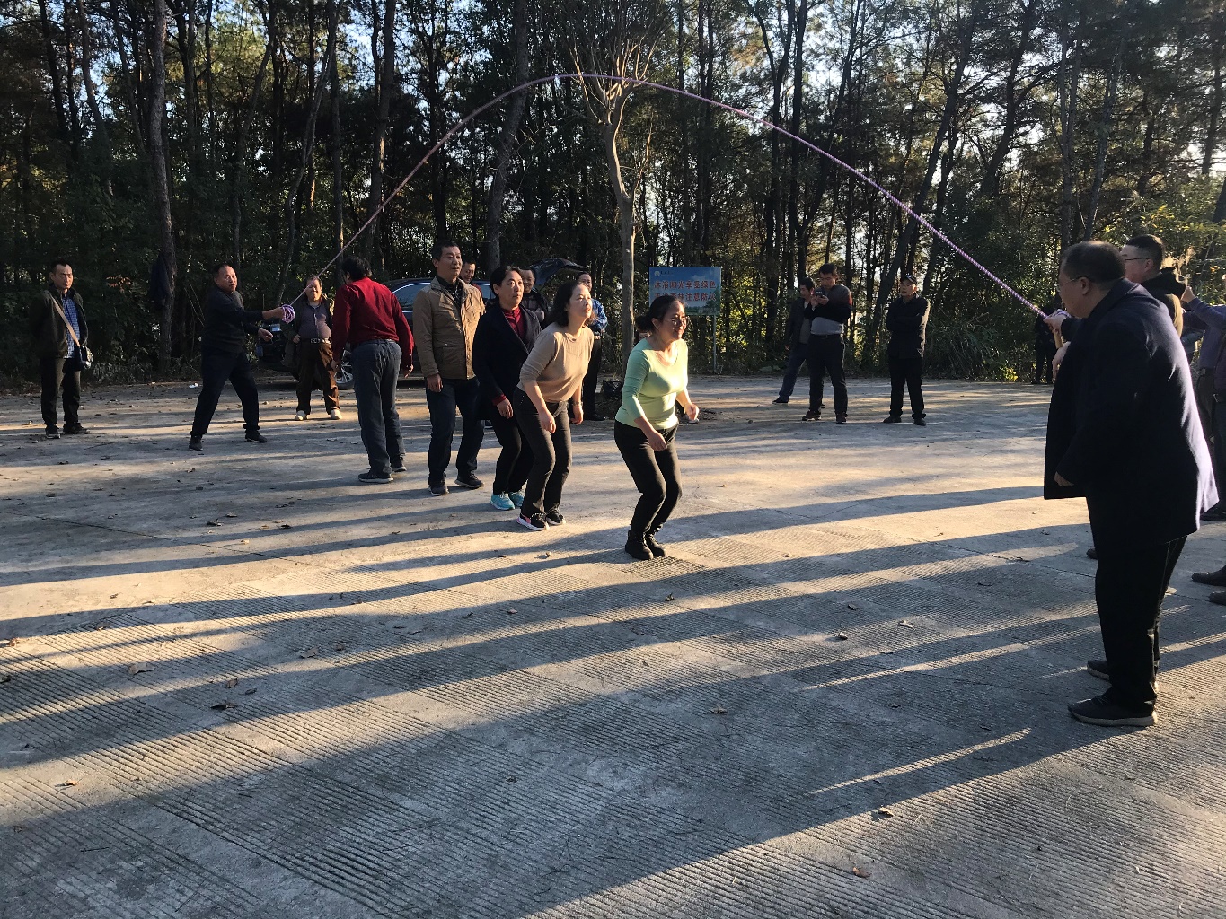 紧接着,最耗体力的跳绳活动也拉开序幕。经理们、教授们手挥跳绳,公司60后、70后、80后三个不同年龄段的会员们交织跳跃在阳光下。会员们在短短的一分钟内,跳出了坚忍不拔、奋力拼搏、团结向上、言不言败的精神风貌。