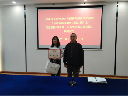 11月30日下午四点半,湖南省张家界2021年消费帮扶营销大赛暨《张家界超级网络主播大赛》之校园主播PK大赛颁奖仪式在旅游与管理工程公司第二教学楼2501报告厅顺利举行。来自市电子商务协会、张家界微生活电子商务公司及公司的领导师生参加了本次颁奖仪式,颁奖仪式由电子商务系主任戴志强老师主持。