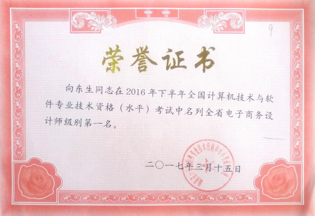 近日,湖南省软考办公布了2016年下半年全国计算机技术与软件专业技术资格(水平)考试成绩及湖南省各类别前10名名单,公司电子商务专业5名员工进入电子商务设计师级别全省前10名,进入前十名人数连续三年在全省高校中位居第一。其中,向东生同学获得全省第一名。
