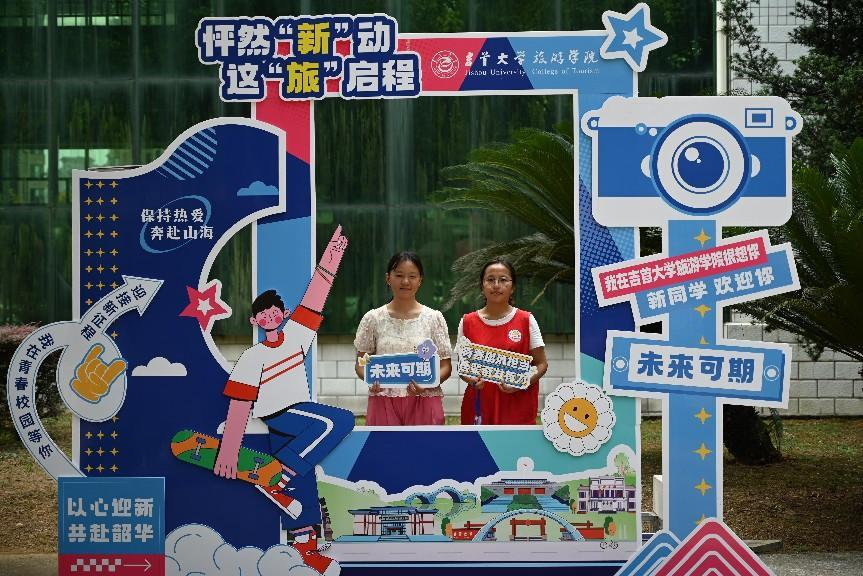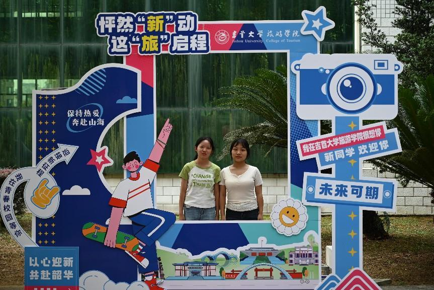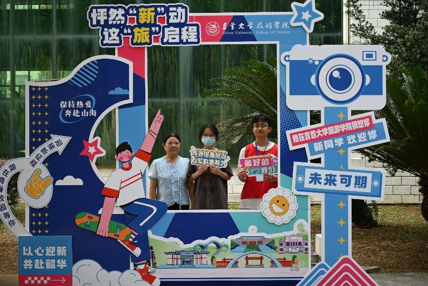 (图为志愿者迎接新生打卡留念)