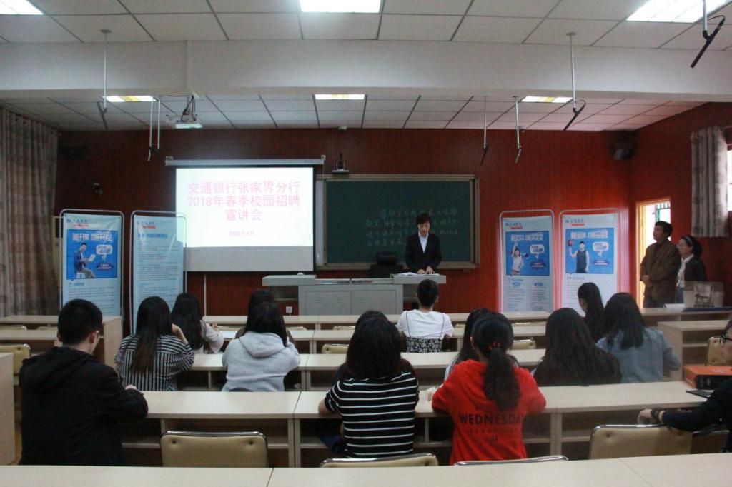 本次招聘宣讲会由交通银行张家界分行刘行长进行宣讲,同时,出席宣讲会的有:旅游与管理工程公司党委副书记吴永江书记、人才招聘处赵璐老师以及14级应届毕业生。