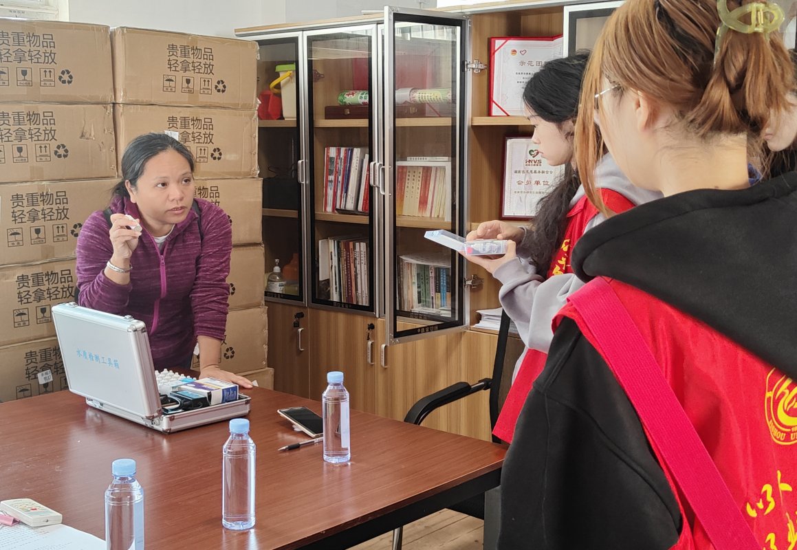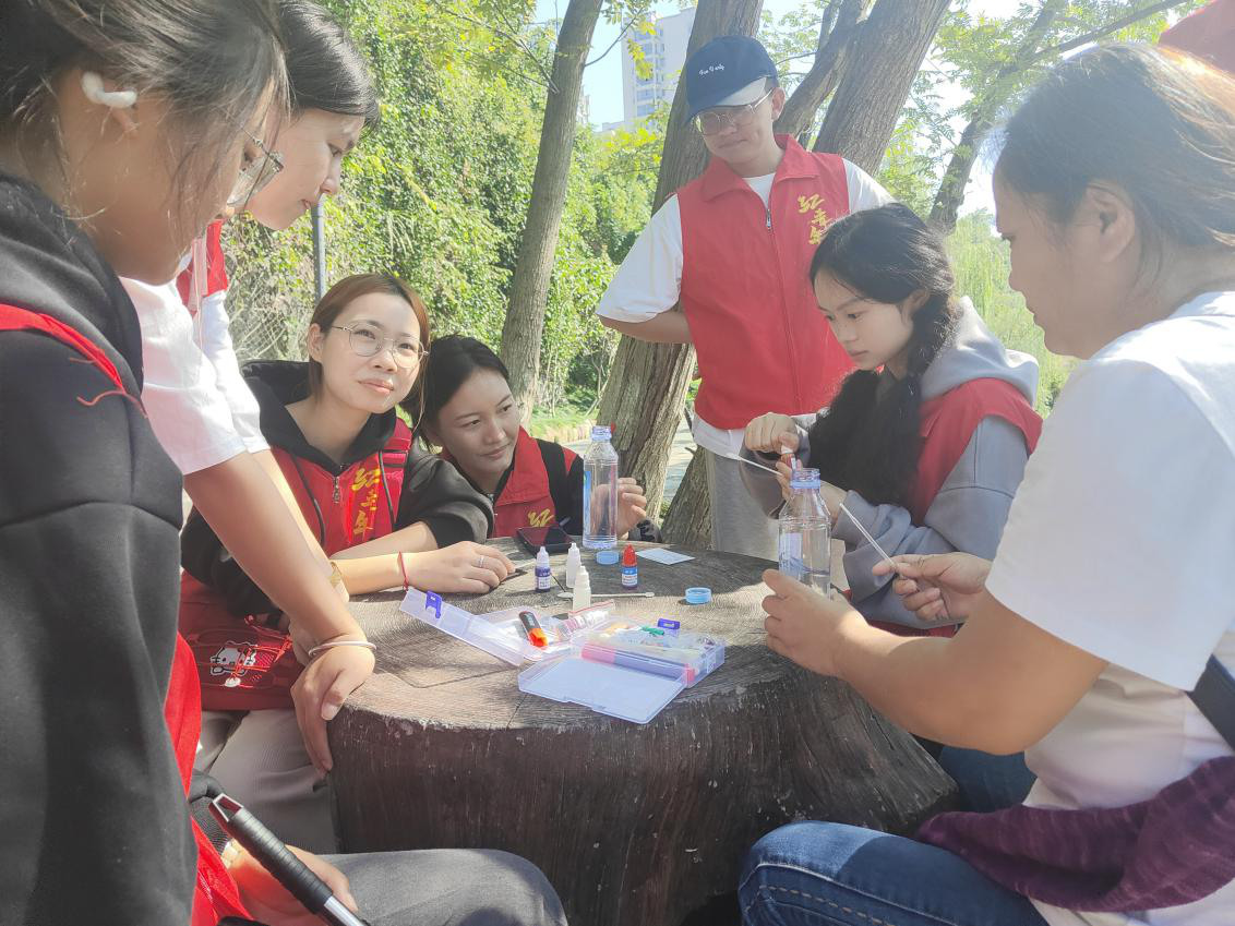 捡拾垃圾结束后,在周海燕会长的带领下,志愿者取来部分井水和河水的样品,运用化学试剂、PH比色卡等专业测评工具进行了水质测评,探究其矿物质含量,余氯含量和自净能力等,将化学原理应用于实际,让志愿者感受到化学的魅力,同时敲响了保护水资源的警钟,增强了志愿者的生态保护意识。