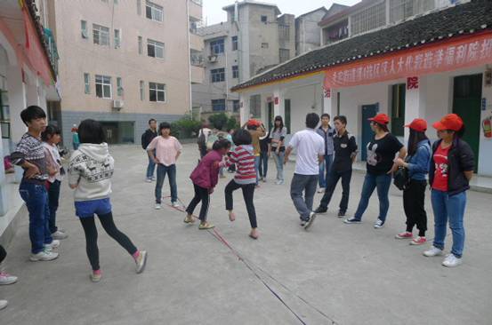 图为部分志愿者们的合影。我们带着爱心,准备出发! 图为志愿者与小朋友的交流活动。—“让姐姐画个喜洋洋送给你” 图为志愿者与小朋友的交流活动。