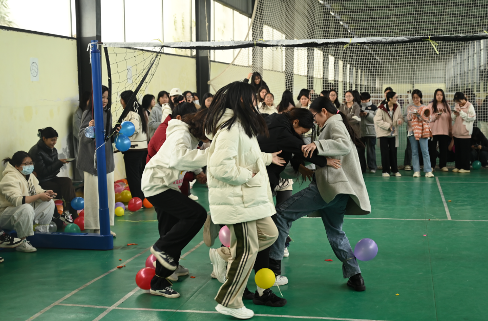 26日中午,“踩踩乐”比赛在室内羽毛球场举行。本次比赛共有十二大组,每一大组中有三小组。首先三小组比赛决出一个小组,再由每个获胜小组派两位代表进行混战决出一到四名。比赛现场,气球爆破声、观众欢呼声喝彩声此起彼伏,热闹非凡。每组参赛选手也不甘示弱,赛况紧张激烈,精彩场面不断呈现,展现了旅游学子朝气蓬勃、力争上游的青春面貌。