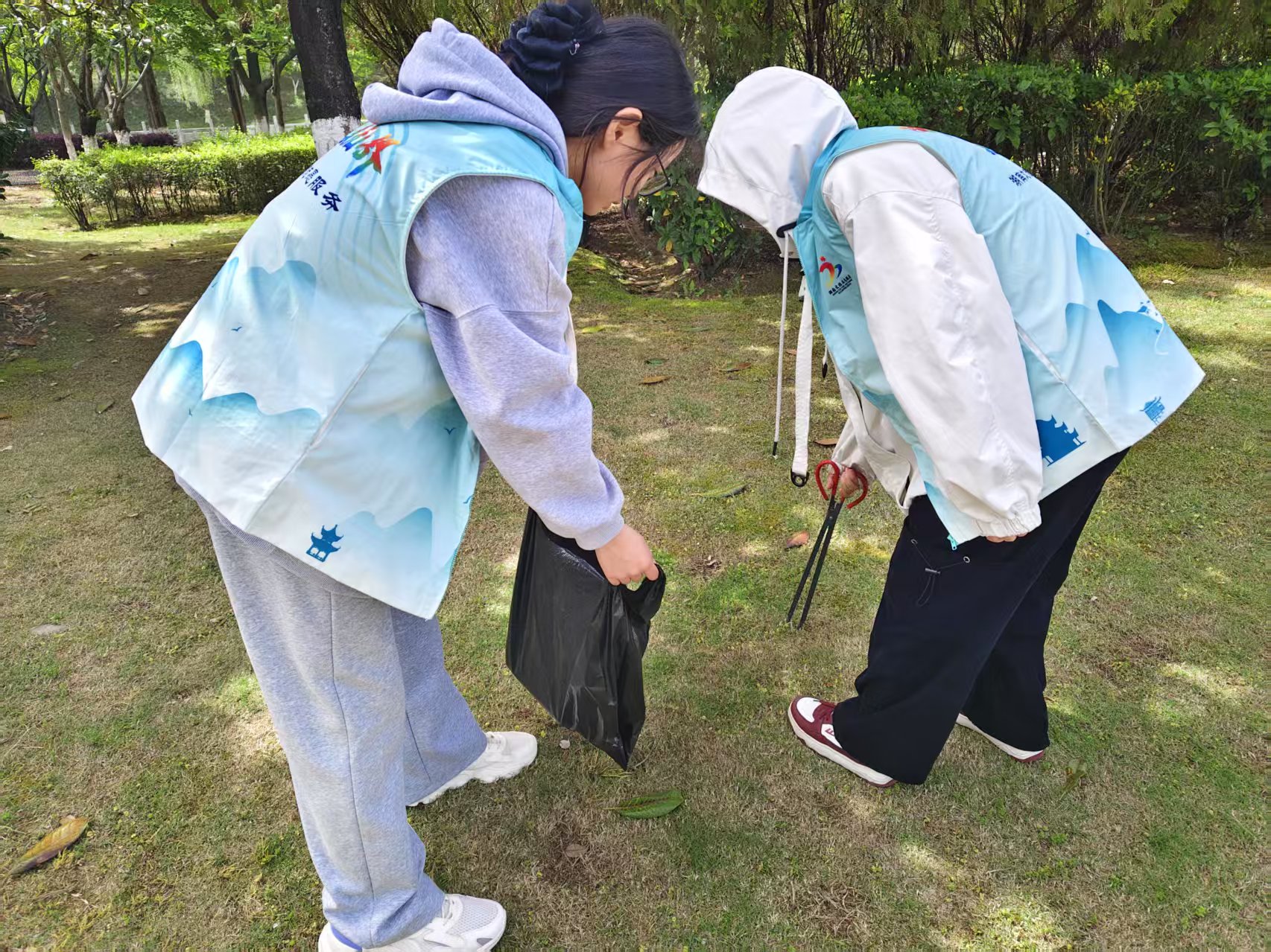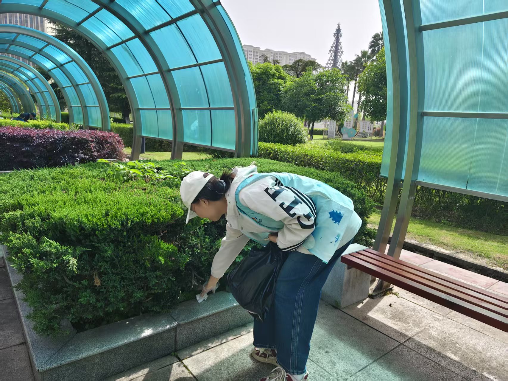上午10时,同学们准时在大庸桥公园入口处集合,活动负责人向他们发放了统一的绿色志愿服、钳子、手套及黑色垃圾袋等工具,并强调安全事项与活动安排。活动开始后,同学们分组行动,深入公园草坪、步道、休闲区和水渠周边。他们有的用钳子夹起隐藏在灌木丛中的烟头、纸屑,有的徒手清理堵塞排水渠的落叶与淤泥,还有的仔细擦拭被涂鸦污染的石凳。尽管四月阳光渐暖,志愿者们始终细致投入,连石缝中的细小垃圾也不放过。经过清理,公园面貌焕然一新,草坪重现青翠,步道整洁如洗,水渠恢复畅通。