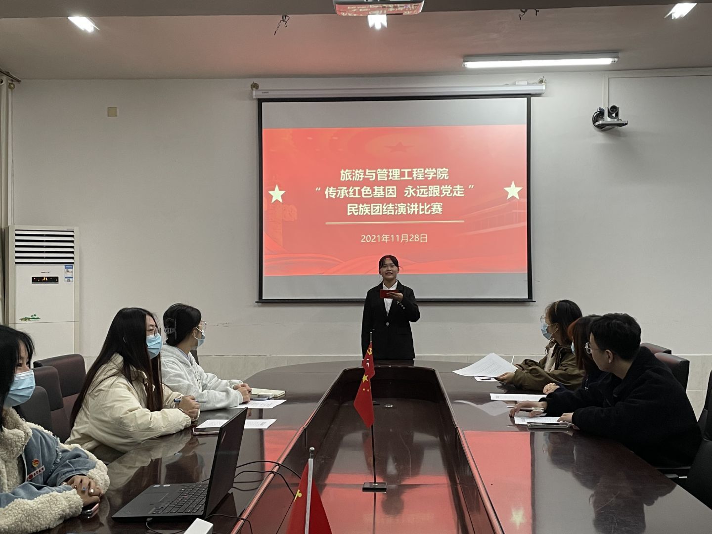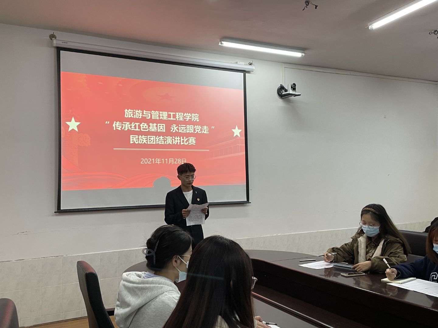 在比赛过程中,各位参赛选手围绕着“传承红色精神,民族团结”的主题依次进行演讲。选手们都用独特的方式表达着对红色精神的领悟,传递着红色精神与民族团结精神。他们的演讲或许并不是那么的完美,但其中流露的真情却让在座同学产生强烈共鸣,赢得了大家的掌声与点赞。
