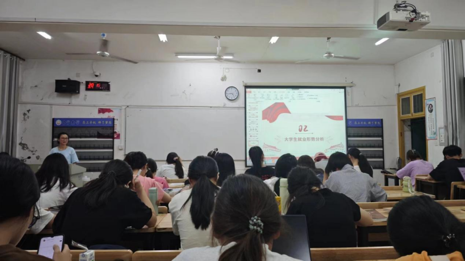 最后,班长讲述了树立正确就业观的方法。第一,调整就业心态,根据自身能力、兴趣和市场需求合理调整,注重自我价值的实现;第二,客观定位,认识自己的优势和不足,明确自己的职业;第三,在求职过程中要克服消极心态,不盲目攀比、跟风,以积极的心态面对就业带来的竞争和挑战。
