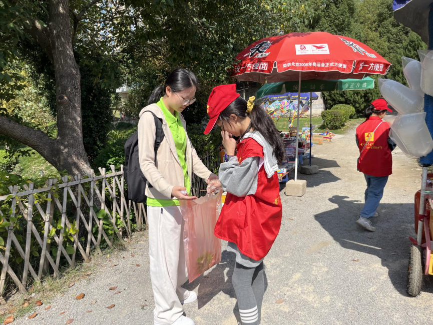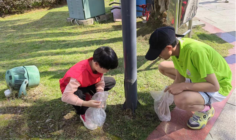 拾叶活动接近尾声,志愿者带领小朋友清理好活动过程中产生的垃圾,并前往公园内捡拾散落在各处的废弃物。朗朗晴空,每一步脚印,每一个弯腰,每一次伸手,让垃圾袋渐渐鼓了起来,尽管额头冒着汗珠,也掩盖不住大家眼角的笑意。