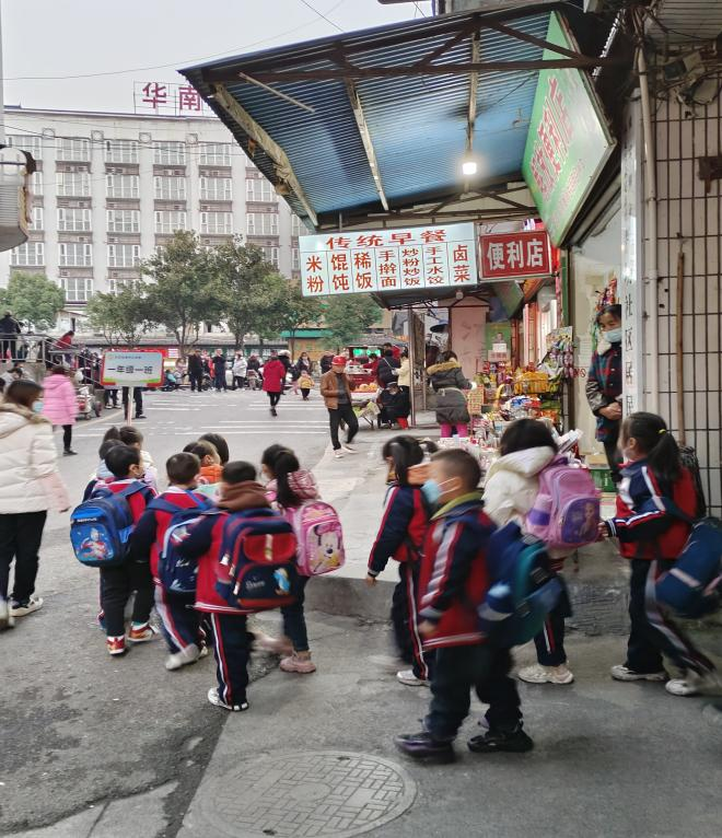 维持秩序:教场社区的服务中心下便是一所小学,马路时常有车辆经过,需保证儿童上学的安全并做好疫情防护工作。志愿者们在此期间进行提醒,一方面维持上下学的秩序,另一方面提醒儿童戴好口罩,做好防护。此外,志愿者还与教场社区的保安商讨了社区秩序维护的相关事宜,进一步了解具体情况并提出相应建议。