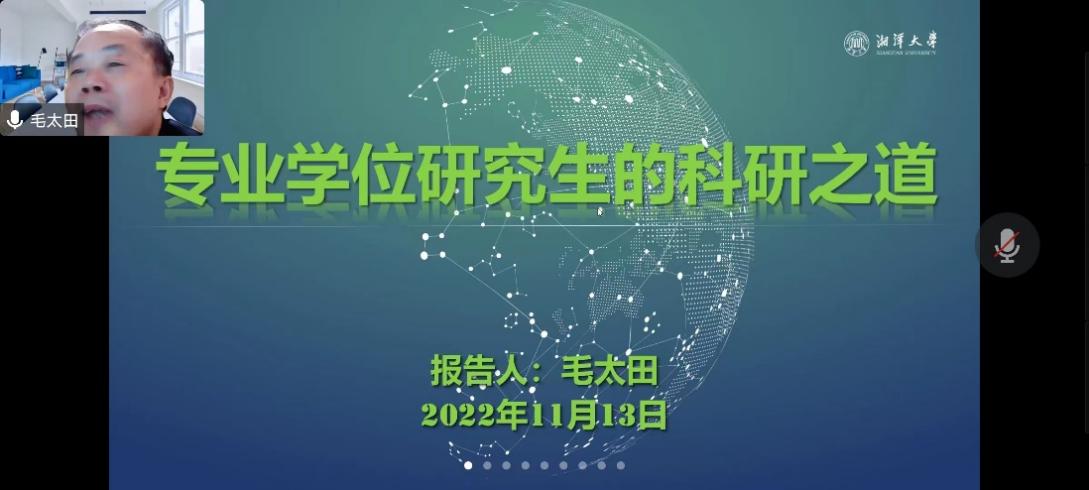 11月13日上午9:30,公司在线上举办研究生学术活动节暨本学年第八期研究生学术讲座。本次讲座邀请了湘潭大学公共管理公司副经理、图书情报硕士专业学位负责人、情报学二级学科学术带头人、博士生导师毛太田教授为公司师生作题为“专业学位研究生的科研之道”的学术报告。学院师生共70余人通过线上参加了本次讲座活动,讲座由副经理董坚峰博士主持。