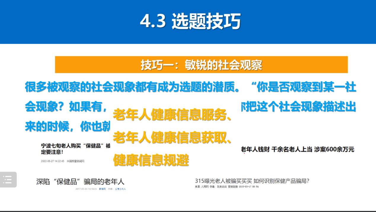 对于研究生科研课题及毕业论文选题,毛教授认为应当遵循导向性、公共性、创新性、前瞻性、可行性、可控性的原则,紧扣国家热点、图书情报前沿和自身知识储备进行选题。最后,毛太田教授结合实例分享了一些选题技巧,使同学们对研究选题有了进一步的了解,能够更好地从事科学研究工作。