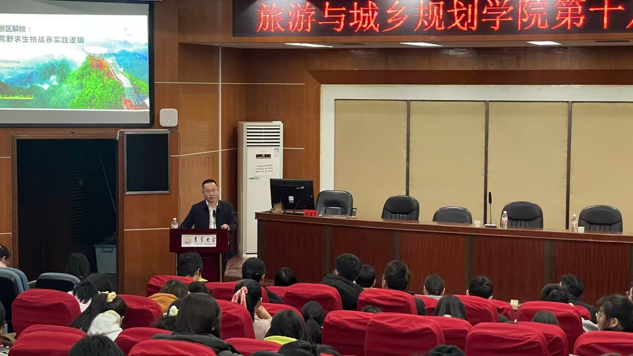 在首场分享中,刘杰董事长以“创新·破局·共生——当前形势下文旅景区运营之道”为题,结合百龙天梯在景区交通运营、品牌塑造、业态创新等方面的实践经验,深入剖析了后疫情时代文旅景区面临的市场变化与破局路径。他提出,景区运营需以“创新”为引擎,打破传统模式桎梏,通过资源整合与业态共生,实现可持续发展。其分享既有宏观行业趋势分析,又有微观运营策略解读,为在场师生呈现了一场兼具理论高度与实践价值的行业盛宴。