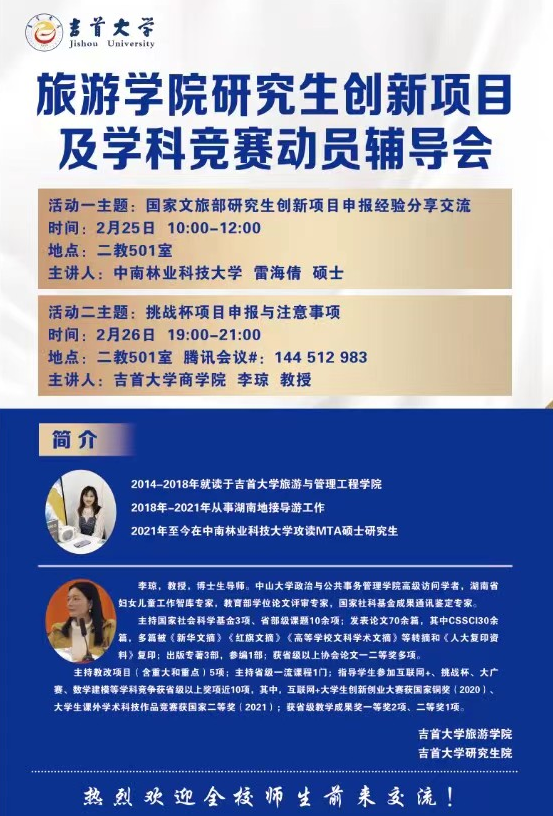 2023年2月25日,公司在二教501教室组织开展研究生创新项目及学科竞赛动员辅导会。“挑战杯”国家奖项目指导老师李琼教授、往届赛事优秀参赛选手雷海倩硕士作为分享嘉宾。伟德bv1946官网研究生及科研创新爱好者参加了此次讲座活动,公司副经理粟娟教授主持。