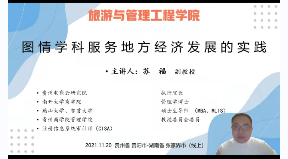 11月20日,公司邀请贵州商公司管理公司硕士生导师苏福博士以《图情学科服务地方经济发展的实践》为题进行主题讲座。讲座采用线上会议形式,由董坚峰副经理主持,公司图书情报研究生和部分导师共70余人参与了此次活动。