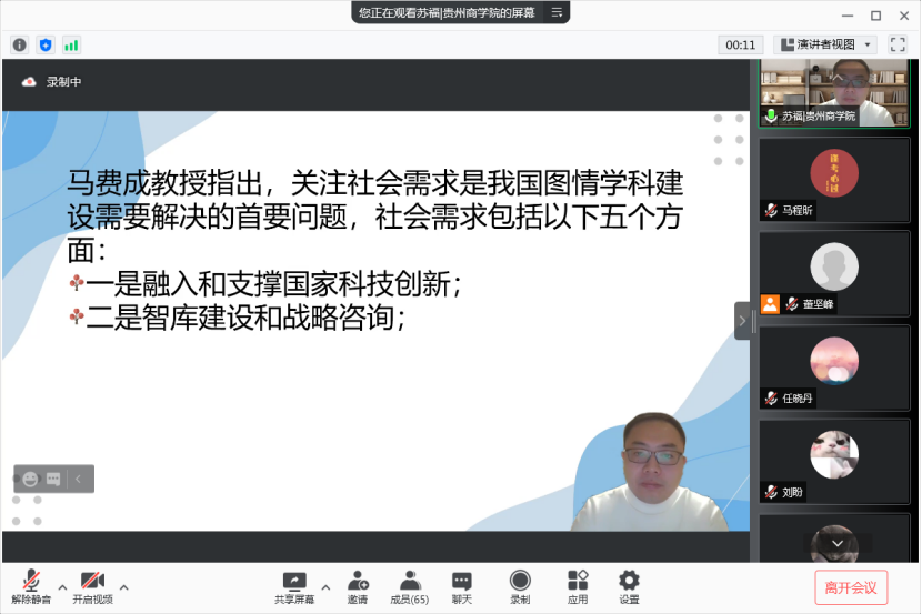接着,苏博士提出当前图书情报学科所面临的问题,即图书情报学科服务地方经济能力、经济手段、经济人才培养等方面的相关问题。苏博士在会议中提到图情学科的地位和影响力在逐渐增加,但是图情下的三个二级学科在研究方向上没有实现实质性的融合且新文科背景下图情学科创新发展的路径仍不完善,也会影响图情学科地位。